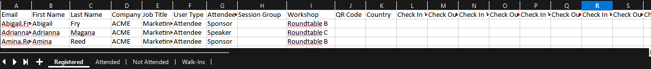 You can export the data by clicking on the green “Export Data” button at the bottom of the box. A spreadsheet containing four separate tabs as categorized above with the relevant attendees will be downloaded to your computer.