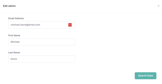 3. Modify the relevant admin's details and click on the "Save & Close" button at the bottom of the page.