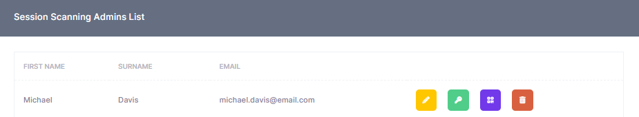 4. The updated session admin's details will be displayed in the "Session Scanning Admins List" table.