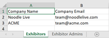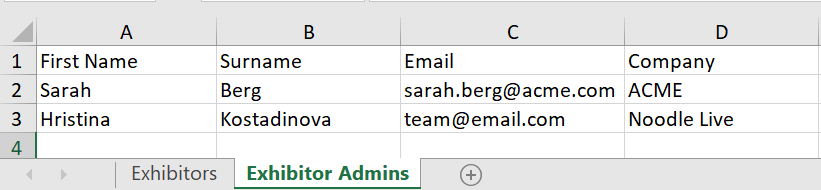3. The file contains two tabs / sheets - Exhibitors and Exhibitor Admins.