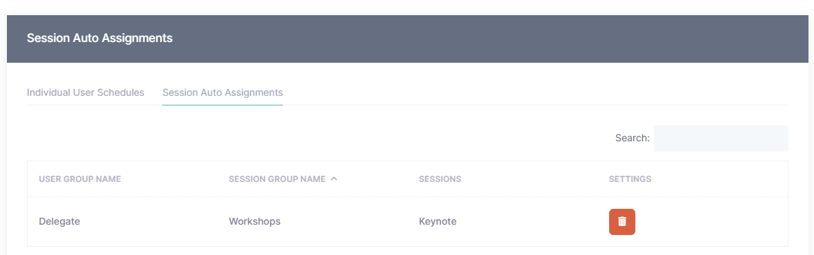 Once imported, the newly created schedule will be available in the “Session Auto Assignments” table at the bottom of the page.
