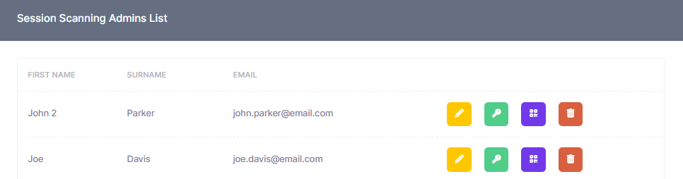 Session Scanning Admins Lists - displays a list of all already added scanning admins with their details, as well as the options to manually edit their information, change their password, see a QR code containing their log in credentials, or delete the entry.