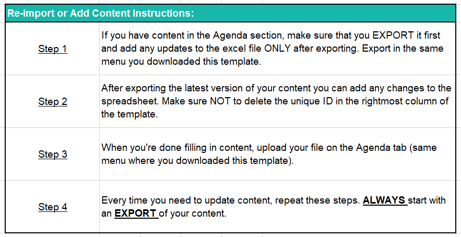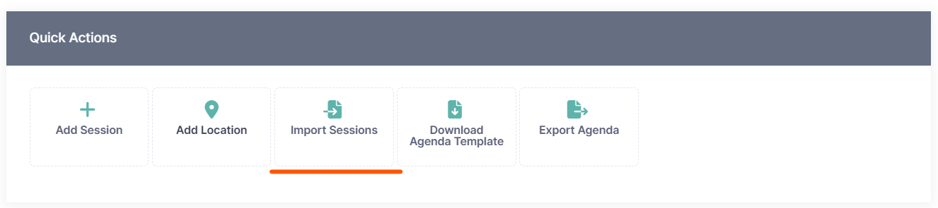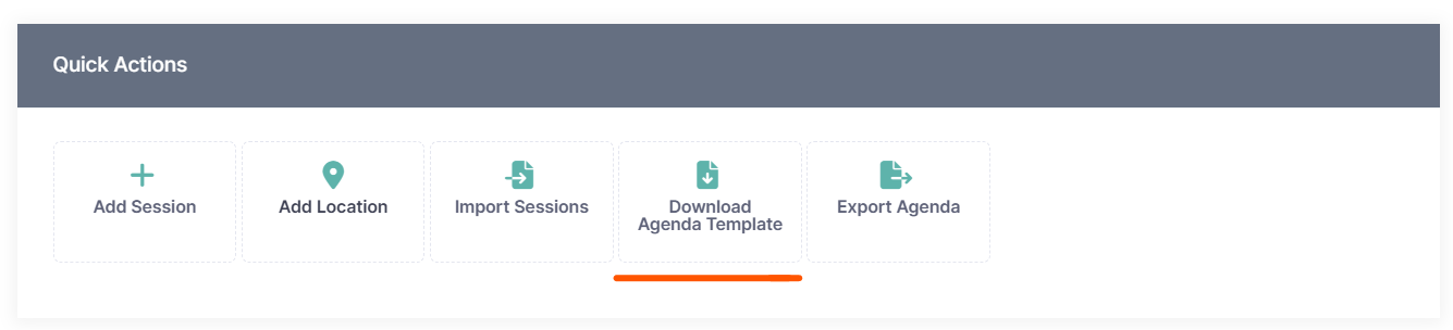 Prior to uploading your agenda, download the session template file by clicking on the “Download Agenda Template” button in the “Quick Actions” section.