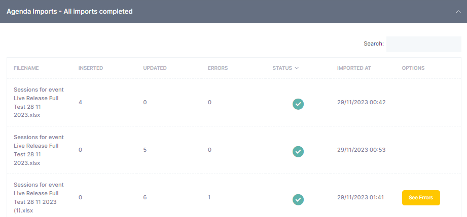 A collapsible list of all uploaded session lists showing any potential errors that might have occurred will be available for future reference and quick access to the uploaded files.