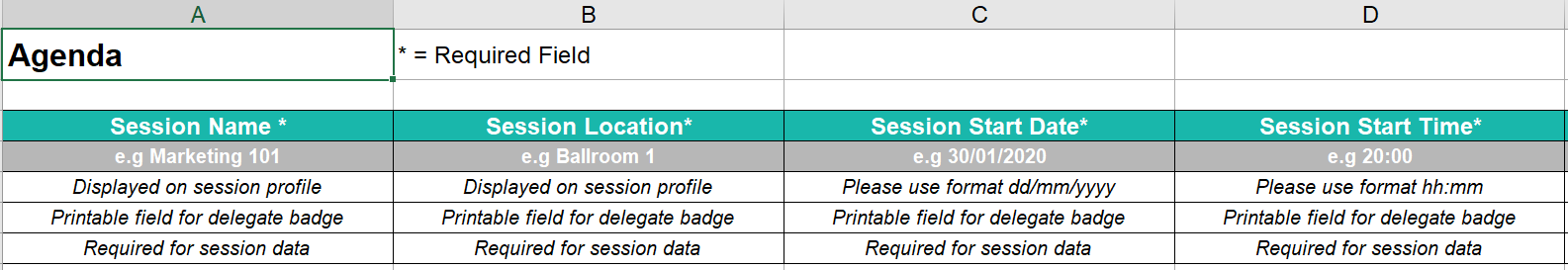 Please do not modify the spreadsheet structure in any way. Simply add the sessions you would like to create on separate rows, populate all relevant details and save the file.