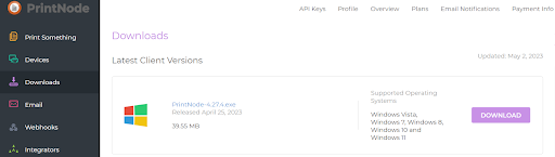 2. Navigate to the “Downloads” section of the navigation menu under your account. Here you will see a list of the latest and previous versions of the PrintNode Client for different operating systems.