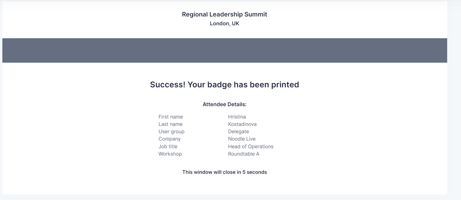 The page will automatically close in 5 seconds and you can proceed to printing a badge for the next attendee.