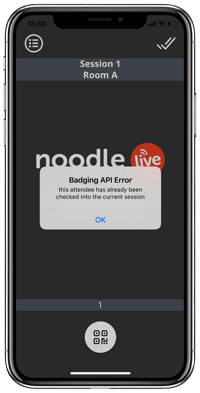 Note that if you try to scan the same badge / attendee into a session more than once, the app will display a message letting you know that the attendee has already been checked-in / checked-out.