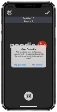 If Capacity Control is enabled, you will scan people into sessions normally until the set capacity is reached. If you scan an attendee's badge after a session has reached the defined capacity, the app will display a pop-up message informing you that capacity is reached.