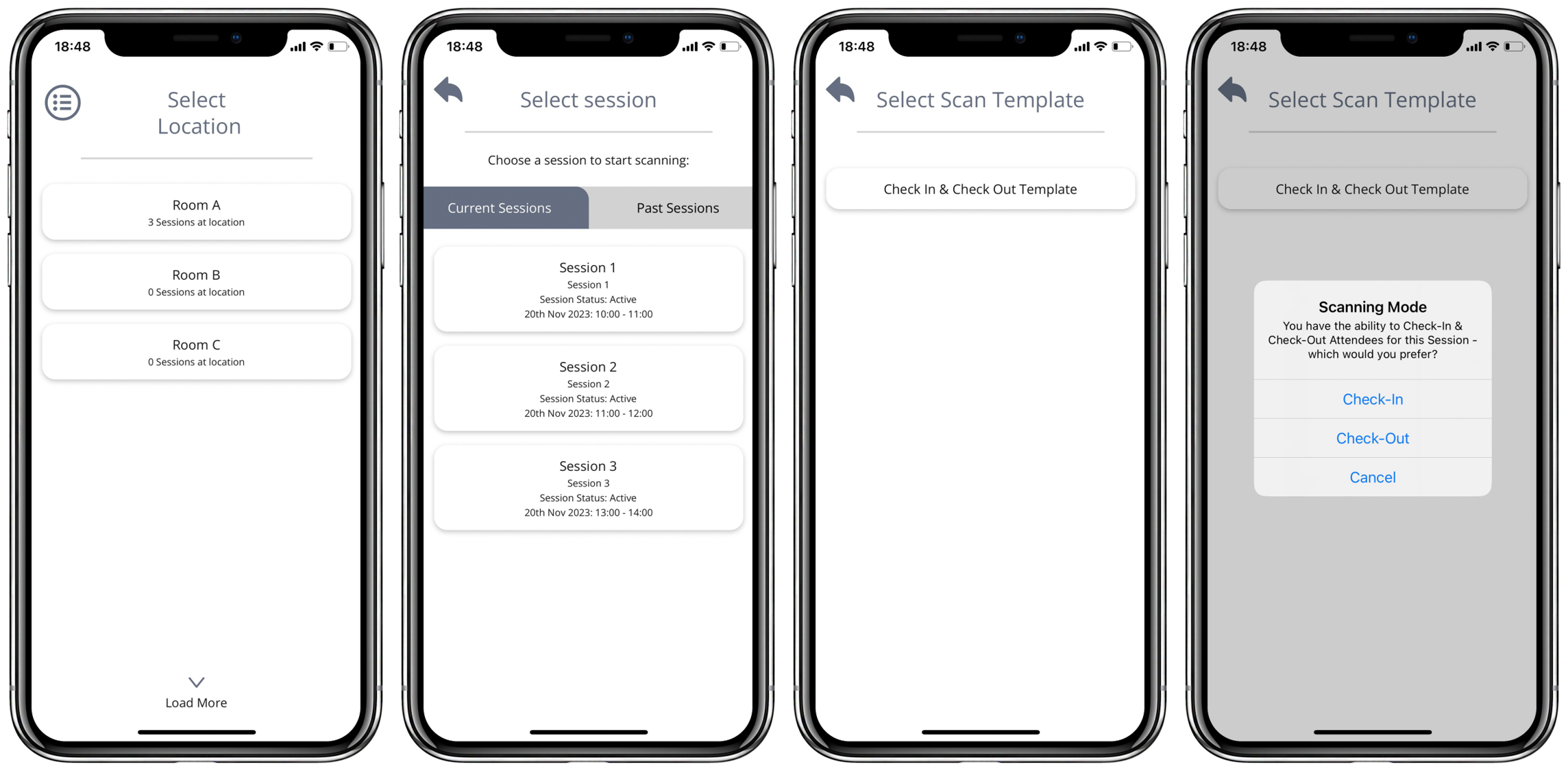 If both scanning modes are available, you need to select whether you would be checking attendees in or out of the selected session.