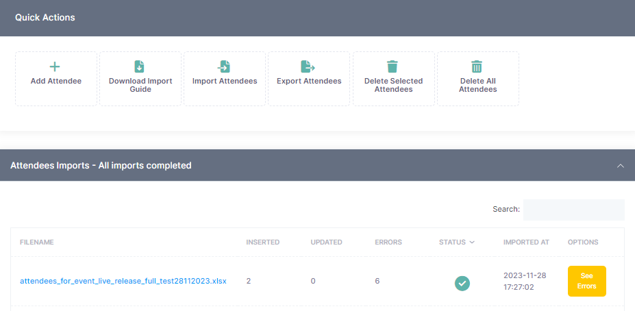 7. Otherwise, upon successful import, the attendee list will be loaded and will become available on the page.